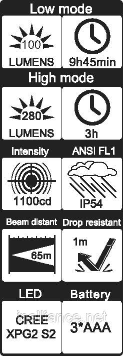| Режими роботи ліхтаря | Максимальний, Мінімальний, Лазер |